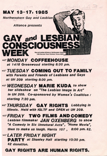 Following Stonewall in 1969, more students initiated lesbian and gay discussion in academic centers throughout the United States, and faculty responded. A new, visible gay presence emerged on Chicago campuses.