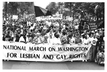 Eight years later, AIDS had wrapped its tentacles around the gay movement, and it was a very different Second National March on Washington for Lesbian and Gay Rights, held Oct. 11, 1987, with an estimated 500,000 to 650,000 people. The mood was somber at the front of the line, as celebrities such as Whoopi Goldberg were joined by many people with AIDS, in wheelchairs. The NAMES Project's AIDS Memorial Quilt was on display during the weekend, and on Oct. 13 the Supreme Court saw its largest protest since the Vietnam War ( more than 800 were arrested, including many future ACT UP Chicagoans and attorney Renee Hanover ) .
