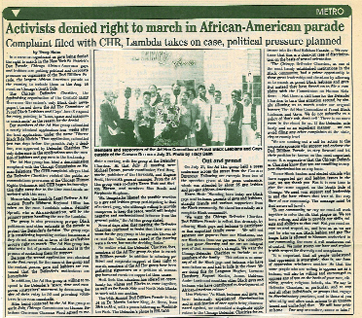 In August 1993 and in two subsequent years, the gay contingent received an almost universally warm acceptance from the crowd. Besides Layne, key people involved were Stephanie Betts, Julianna Cole, Karen Hutt, Saundra Johnson, Karen Long, Lisa Marie Pickens, Stephanie Stephens, Valeria Lopez, Robert T. Ford, Michael O'Connor, Michael Harrington, Michael Norman Haynes, Max Smith, and Shelton Watson. Otis Richardson videotaped the marches.
