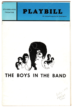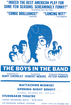 In December 1969, Mart Crowley's play The Boys in the Band opened at the Studebaker Theatre in the Fine Arts Building on South Michigan Avenue. On the eve of the Hooker Report, just months after Stonewall, and weeks after Time magazine's cover feature on "The Homosexual in America," Mattachine Midwest ran a benefit at the Dec. 2 opening, selling 300 "choice orchestra seats." Columnists and reviewers had a field day commenting as much on the audience as on the play.